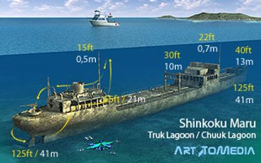During World War II Truk Lagoon was the Empire of Japan's main base in the South Pacific theatre. Known as the “Gibraltar of the Pacific,” Truk Lagoon was a heavily fortified base for Japanese operations against Allied forces in New Guinea and the Solomon Islands. Truk served as the forward anchorage for the Japanese Imperial Fleet. February 17-18, 1944, Truk was devastated in one of the most important naval attacks of the war, "Operation Hailstone", Task Force 58 strikes resulted in the loss of 250 airplanes and 61 ships, in total 10 naval vessels (two cruisers, four destroyers and four auxiliary vessels), but mostly "Maru" or merchant vessels which had been left at anchor whilst some 200 other vessels were safely evacuated to Palau. Truk was eliminated as a major fleet anchorage for the IJN. The event is often referred to as the Japanese equivalent of Pearl Harbor. The result of this attack is now a collection of shipwrecks closely packed into a coral lagoon, many of which lie at depths easily reached by recreational divers. Making Truk Lagoon among the top wreck diving spots of the world with the world’s biggest ship and aircraft graveyard.